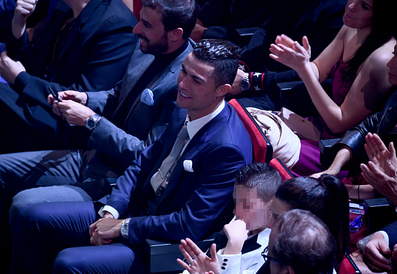 La primera vez apareció con un vestido joya que bien podría ser el de su anhelada boda con Ronaldo. Hasta cuatro vestidos lució durante la noche la novia del futbolista portugués, que desde las primeras filas siguió junto a su hijo mayor las apariciones de la modelo sobre las tablas.