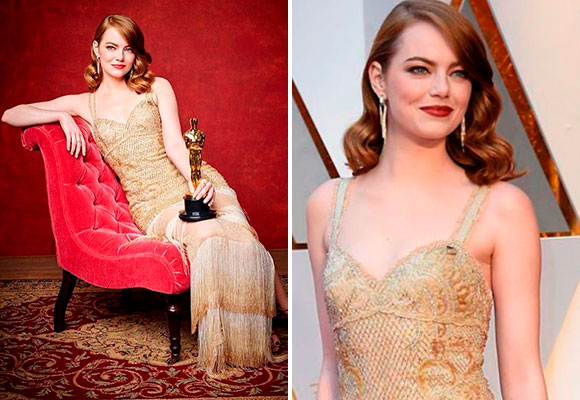 A ritmo de La la land Emma Stone consiguió su primer Oscar a Mejor Actriz en 2017. Esa noche, además de llevarse el premio, también se coló en las listas de las mejores vestidas por un precioso modelo de alta costura, corte recto y ajustado al cuerpo firmado por Givenchy. Era un vestido lleno de detalles, el cuerpo era entero de encaje dorado y pedrería, mientras que la falda estaba compuesta por miles de flecos en degradé que recordaban a los vestidos de charleston de los años 20.