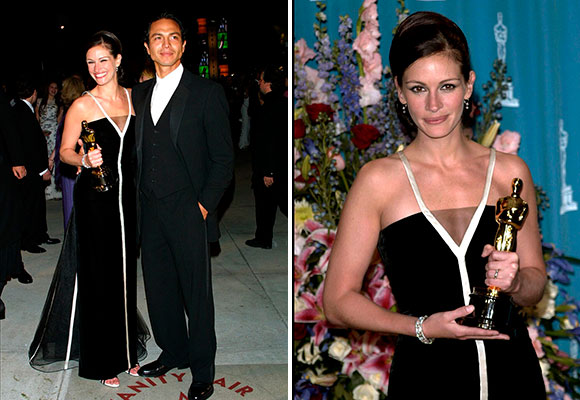Julia Roberts se decantó por un vestido de la colección de Valentino de 1992. Se trataba de un diseño confeccionado en terciopelo negro con tirantes blancos que partían del escote con forma de V y continuaban por la espalda hasta llegar a la cola, formando rayas. La anécdota del vestido está en que la propia actriz ha confesado que aún lo conserva, en concreto lo tiene guardado en una caja bajo su cama, y es probable que algún día se lo veamos puesto a su hija.