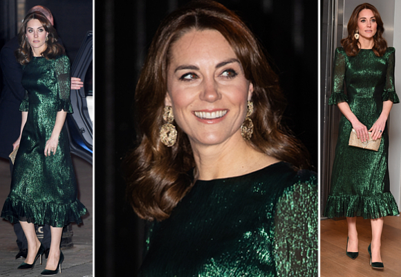 Y Kate Middleton brilló con luz propia gracias al vestido escogido. Un diseño ceñido en tono verde firmado por The Vampire’s Wife . Se trata del modelo Falconetti que la casa británica asegura que está elaborado con gasa metálica de seda esmeralda iridiscente. Un diseño de longitud tres cuartos terminado con volantes suaves recogidos en el dobladillo. Las mangas son semitransparentes ribeteadas con volantes. Su precio se acerca a los 1.600 euros.