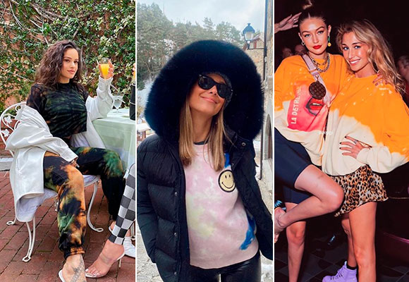 Sus colores alegres y llamativos son una de las características que más saltan a la vista. Es un estampado que podemos encontrar en cualquier prenda: camisetas, pantalones, camisas… pero es en las sudaderas donde más lo estamos viendo. Las influencers Mery Turiel, Marta Lozano o Sara Baceiredo se han decantado por un modelo muy similar en el que los colores cálidos y suaves, combinados con el blanco son los grandes protagonistas. María Pombo ha optado por un modelo de color rosa pastel con un pequeño estampa tie-dye amarillo y un emoticono sonriente. También celebrities como Rosalia, Kylie Jenner o Gigi Hadid han lucido esta setentera tendencia recientemente.