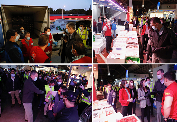 El rey Felipe VI y la reina Letizia visitan de madrugada Mercamadrid para agradecer el esfuerzo que han hecho los responsables del sector logístico para hacer más llevadero el confinamiento.