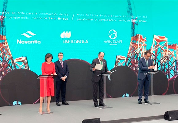 El contrato, cuyo importe total asciende a 350 millones de euros, supone el mayor de la historia de Navantia-Windar en el sector de la eólica marina. El acuerdo se ha formalizado en el astillero de Navantia en Fene, A Coruña, con la presencia del presidente de Iberdrola, Ignacio Galán, la presidenta de Navantia, Susana de Sarriá y el presidente de Windar, Orlando Alonso. También asistieron el presidente de la Xunta de Galicia, Alberto Núñez Feijóo y del delegado del Gobierno en Galicia, Javier Losada.