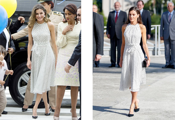 Otro de los looks repetidos de la reina más aplaudidos es el que le vimos durante su último viaje oficial a Cuba. Durante esos días, Carolina Herrera se convirtió en la diseñadora favorita de la reina Letizia, que no dudó en rescatar de su armario uno de sus diseños más sencillos y bonitos. Hablamos del sofisticado vestido de seda blanca con topitos negros, cuello halter y falda de vuelo de corte midi. Un traje aparentemente simple, pero con el que estaba muy favorecida, pues se ajusta a la cintura con un lazo del mismo tejido que el vestido, realzando su esbelta figura.