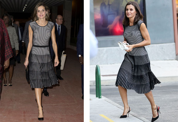 Este veraniego vestido es entallado, sin mangas, con cuello caja, cuerpo ceñido y falda de corte midi y evasé. Destaca en él el print de finas rayas blancas y negras que crean un curioso efecto óptico. Sin duda, uno de sus vestidos favoritos, que también ha enamorado a la princesa Leonor, que este verano acudía al teatro con sus padres luciendo un diseño muy similar.