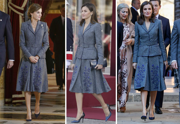 Se trata de un dos piezas de lana en color gris oscuro, compuesto por una falda midi con unas flores bordadas en color azul oscuro, y una chaqueta ajustada con cinturón. La primera vez que lo lució fue en el Día de la Hispanidad de 2017, y desde entonces ha confiado varias veces en él.