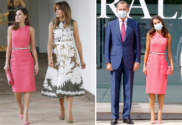 Para su primera visita a Donald y Melania Trump en la Casa Blanca Letizia escogió un vestido rosa fresa de la firma Michael Kors. Un traje que la primera dama de Estados Unidos también tenía en su armario, pero en color azul, y que había lucido en otros encuentros con presidentes y mandatarios.