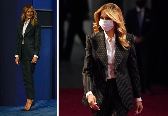 La actual primera dama, Melania Trump, apostó por un look sobrio y elegante que firma una de sus marcas favoritas Dolce & Gabbana. Se trata de un traje de dos piezas de raya diplomática con chaqueta y pantalón, cuyo precio asciende a 2.125 euros.