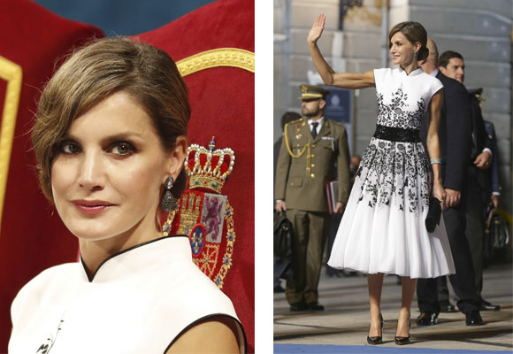 Uno de los looks más aplaudidos y favorecedores de Letizia es el que llevó en los Premios Princesa de Asturias de 2017. Otro diseño de Felipe Varela, que hace unas semanas se vendía en la web del diseñador a precio de saldo. Se trata de un vestido de inspiración oriental, confeccionado en georgette de seda blanco y con bordados en hilo negro con flores, garzas y el símbolo de la longevidad. Una prenda que se ceñía a la cintura gracias a un cinturón negro de cristales, a partir del cual salía la voluminosa falda.