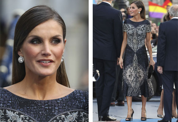 Un año antes, Letizia había deslumbrado en la capital de Asturias con uno de los looks más espectaculares que ha lucido hasta el momento en los premios. Un look firmado por Felipe Varela y creado en exclusiva para esa cita. Se trata de un vestido de corte midi con patchwork brocado y bordado a mano en hilo, cristal y metal. Una pieza con líneas rectas que juega con el dibujo del estampado para romper con la sencillez del vestido.