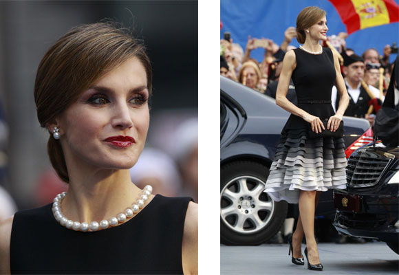 La reina completó el outfit con unos salones negros de charol de Magrit y una cartera de mano que creó Felipe Varela a conjunto. Además, la reina optó por lucir un recogido y destacar unos de sus pendientes favoritos De Grisogono con 432 diamantes negros con forma de lágrima.