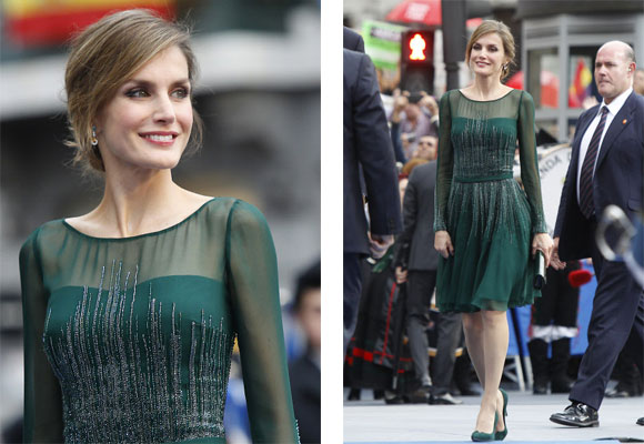 Y acabamos el repaso con la edición de 2013. Letizia acudía a los Premios Príncipe de Asturias con un look en un color que nunca había lucido, el verde. Felipe Varela diseñó este elegante vestido con transparencias en georgette de seda verde veronés, bordado en cristal jade, esmeralda y black Diamond. Un diseño sencillo e ideal para la ocasión que lució junto a un bolso de mano charol y unos zapatos de ante del mismo tono.