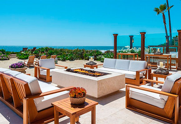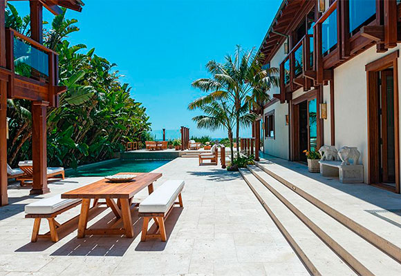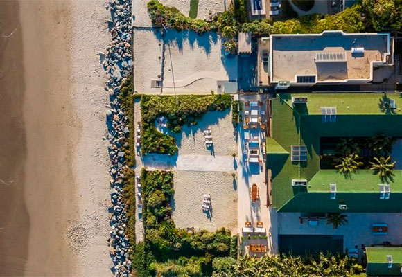 Desde el aire podemos ver que la mansión de Pierce Brosnan tiene forma de J invertida, con una pequeña casa de invitados frente al palito más bajo. Debajo de la J nos encontramos una extensión de terreno ajardinado, un pedacito de playa y una amplia zona de disfrute al aire libre, con barbacoa, comedor, chimenea exterior y hasta un Chill Out con mucho pedigrí. Detrás de este, frente al mar, una piscina de agua salada con cascada entre el edificio principal y el de huéspedes.