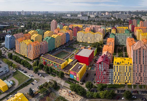 En Kiev han construido un confortable barrio, al que han teñido de luz y color (mucho color), un moderno éxito de promoción inmobiliaria y urbana.