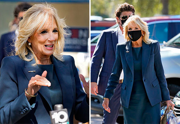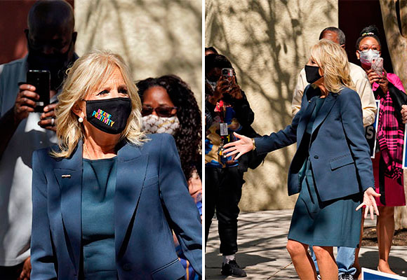 En el mismo estado, pero en la otra punta en cuanto a estilo, estaba Jill Biden. La esposa del candidato demócrata acudía a las urnas con mascarilla y muy amable se paraba para atender a la prensa. Si el look de Melania ha recordado al de Jackie Kennedy, para otros el outfit de Jill Biden está claramente inspirado en otra primera dama, Brigitte Macron.