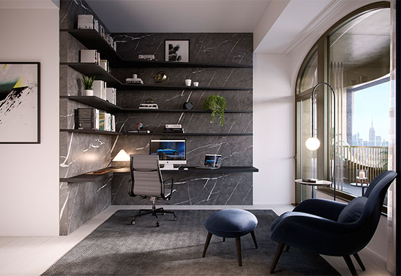 El salón brinda acceso directo a la terraza que combina espacios interiores y exteriores, algo difícil de encontrar en Nueva York. Junto al comedor hay una cocina de planta abierta que cuenta con armarios italianos de roble ennegrecido con textura personalizada; electrodomésticos Gaggenau de última generación; encimeras de mármol seleccionadas a mano de los Alpes Apuanos en la Toscana (Italia); y una encimera de mármol Nero Marquina junto con asientos en barra.