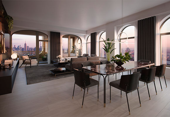 En el interior de cada hogar, los residentes encontrarán una gran sala de estar y comedor, con muebles, textiles y accesorios seleccionados por Marek Reichman y Sir David Adjaye. La sala de estar ofrece vistas de toda la ciudad, líneas limpias, y elegantes muebles de la colección Aston Martin Home de Formitalia, fabricado en Italia. Los sofás y sillones combinan elementos de cuero, metal y tela, así como hermosos detalles para evocar las cualidades táctiles y ricamente elaboradas en los interiores de los coches de Aston Martin.