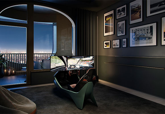 Los compradores tienen la opción de personalizar una de las habitaciones, como un simulador de carreras, un espacio de oficina y biblioteca, o un dormitorio. La sala del simulador es la elección perfecta para los verdaderos aficionados al automóvil. Aston Martin Design colaboró con Curv Racing Simulators, una nueva empresa de tecnología británica fundada por Darren Turner, el tres veces ganador de las 24 Horas de Le Mans para Aston Martin y un experto industria en tecnología de simulación de carreras. Gracias a él, los clientes podrán tener lo último en simuladores de lujo para casa.