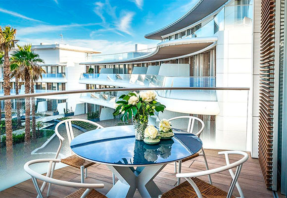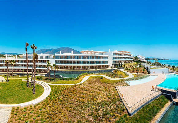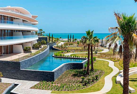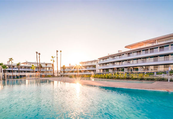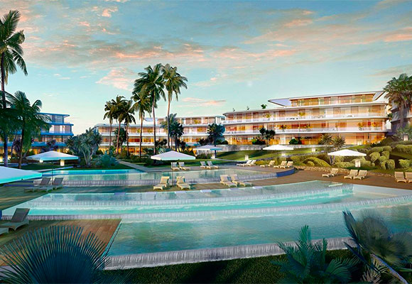 Apartamentos de color blanco, con amplios espacios verdes y piscinas infinitas