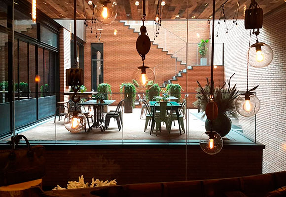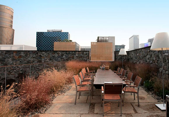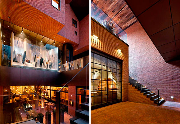 Todo el inmueble se une en vertical gracias al concepto de plaza. De esta forma, se hace palpable la idea que los artesanos y diseñadores puedan convivir junto a los clientes y visitantes. Una escalera de ladrillo conduce a un espacio abierto, planteado como una pasarela para desfiles de moda, y a la cubierta del inmueble, que se transforma en la zona verde del poblado, con estanques poco profundos y elementos vegetales.