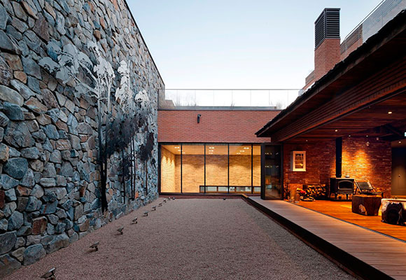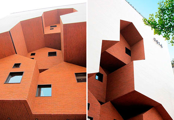 Claro que, introducir un pequeño pueblo en un limitado solar, puede ser una ejecución de imposible materialización, por lo que los diseñadores decidieron apilar las casas del poblado de forma inversa, como si fuera un negativo. Así han tallado las casas invertidas en un romboide de ladrillo, que ocupa los límites de la parcela, llenando estos espacios con pequeñas tiendas y estudios del comercio. Sin palabras.