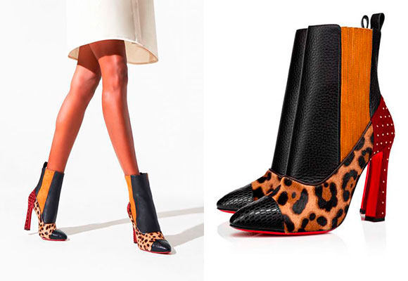 Un claro ejemplo de bota diferente e irrepetible lo encontramos en la última colección de Christian Louboutin. La conocida firma de zapatos de suela roja ha creado unas espectaculares botas que combinan la punta de piel de becerro negra con relieve de serpiente, el cuero granulado negro del empeine, un tacón de ante rojo con tachuelas doradas y, para rematar, un panel elástico de tiras de cuero de color arena.