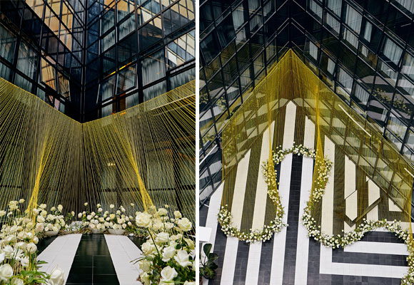 El resultado es un jardín construido con 1.500 rosas blancas ‘PrimaRosa’ traídas especialmente desde Ecuador; 250 narcisos y 250 muscaris que representan el viento y la nieve. Sobre ellos, 3.000 metros de cuerdas de algodón amarillas dispuestas estratégicamente. “Es como si el edificio fuese un árbol y las cuerdas lo protegieran de las inclemencias del tiempo”, explica Sylvia.