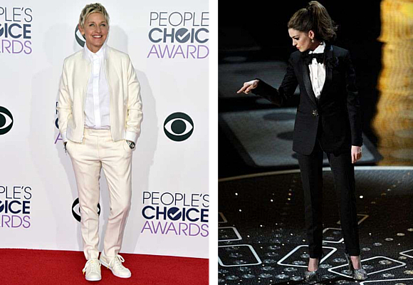 Pero no queda aquí la cosa, ya que el traje que la actriz Anne Hathaway utilizaría en la gala de los Oscar de 2011 (uno de sus once modelos) es uno de los más recordados de los últimos años. Sin tanta sobriedad, han sido sobre todo las actrices las que han adaptando el traje de chaqueta y pantalón a su vestuario y algunas, como Ellen DeGeneres, han recurrido al color para convertir el conjunto en algo único y personal.