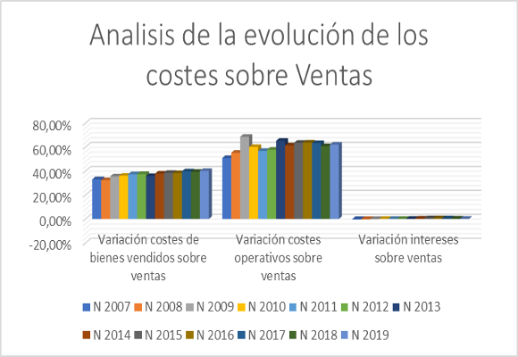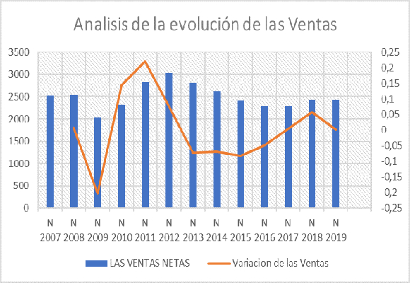 Los ingresos netos por ventas en los nueve primeros meses del año han ascendido a $ 2.438,522 millones, lo que representa un incremento del 0,16 %, respecto al mismo periodo del 2018, gracias a la evolución de EE.UU. que ha compensado la mala evolución del mercado internacional. Es significativo el traspaso planificado de ventas de Hollister, frente a Abercrombie, en un intento de romper con un negro pasado. Como podemos observar en el siguiente gráfico, la mejora del crecimiento de ventas al que llevábamos asistiendo desde el 2015, potenciado en los dos últimos años, se ha visto rota con la evolución de estos nueve meses.