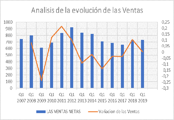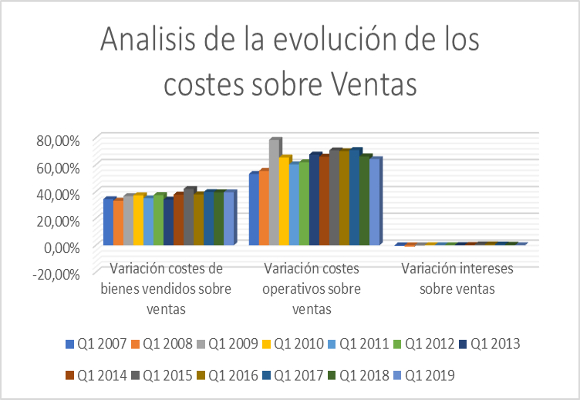 Los Ingresos Netos por Ventas de $ 733,972 millones, lo que representa un incremento del -0,42 %, respecto al mismo periodo del 2018, gracias a la evolución de EE.UU (+4,57 %) que ha compensado la mala evolución del mercado internacional. En cuanto a la evolución por marca, mientras que Hollister crece a un ritmo del 1,14 %, respecto del año anterior, Abercrombie caía, un -0,57 %. Como podemos observar en el siguiente gráfico, la mejora del crecimiento de ventas al que llevábamos asistiendo desde el 2015, potenciado en los dos últimos años, se ha visto roto con la evolución de este trimestre.