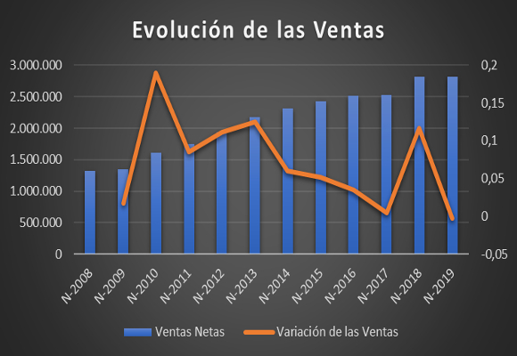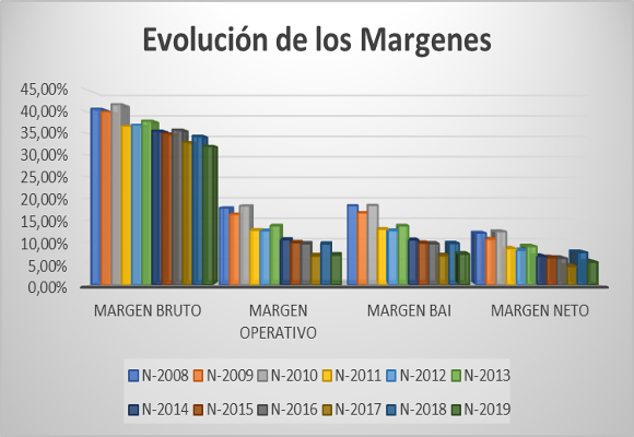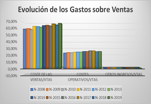 Con este nivel de ventas, la posible contención en los gastos sobre ventas, que ascienden a $ 1.908.178 miles, obtienen un crecimiento, en valor absoluto, del 3,29 %, pero, lo que es peor, representando un 67,81 % del total facturado, con una importante subida de 234 p.b. con respecto al año anterior. Esto implica que el beneficio bruto, con $ 906.033 miles, caiga un 7,00 %, respecto al mismo periodo del año anterior. Así, el margen bruto se sitúa en el 32,19 %, el más bajo en la historia de la compañía.