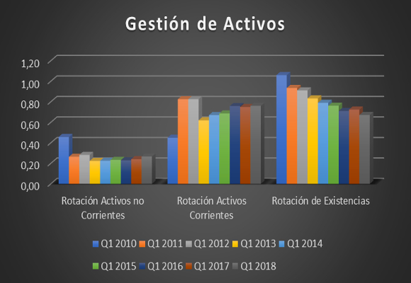 - Diversidad de sentidos en los resultados en la gestión de los activos. Buena evolución de la rotación de los activos corrientes y no corrientes, pero una mala gestión de existencias y de plazos, con cierta infrautilización, como podemos ver en los dos gráficos siguientes: