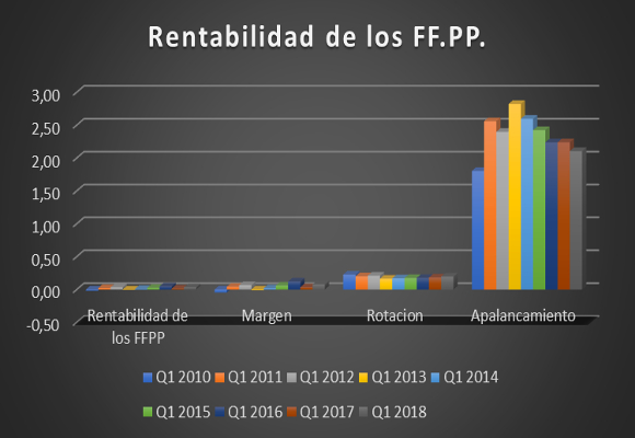- Nos encontramos con una fuerte recuperación de la rentabilidad de los Fondos Propios gracias a la buena evolución de márgenes y el mantenimiento de la rotación, que han compensado la caída del apalancamiento, como podemos observar en el siguiente gráfico: