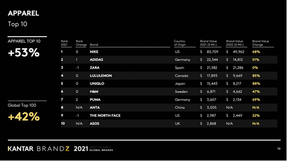 Dentro las firmas que se vieron más privilegiadas destacan Lululemon, Nike y adidas. Estas tres son consideradas las más valiosas de athlesiure y tienen un promedio de 130 en el índice de diferencia (la marca promedio obtiene una puntuación de 100). Nike obtiene el liderazgo absoluto con el top 1 de esta categoría con un crecimiento de valor del 68 %; y a más distancia por valoración de la segunda marca del Top 10, en segunda posición del ranking la alemana adidas con un crecimiento del 51 %.