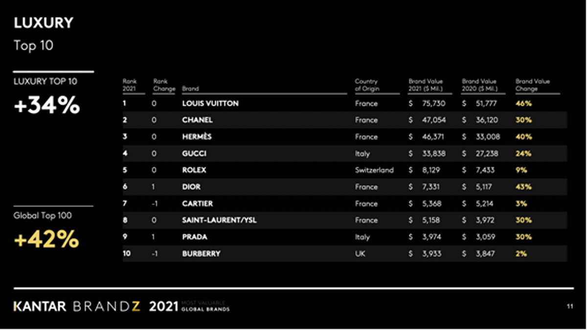 Chanel se posiciona en el segundo puesto y también repite el mismo puesto que en años anteriores, con un crecimiento del 30 %. En el Top 3 se sitúa Hermès con un crecimiento del 30 %, repite puesto en el ranking. Luego ya está la marca de la compañía Kering, Gucci, en la misma posición que el año pasado y con un crecimiento del 24 %. Rolex con un discreto crecimiento del 9 %. La citada Dior. Cartier, que pierde posición con un discreto crecimiento del 3 %. En el Top 8 repite puesto la marca francesa Yves Saint Laurent con un crecimiento del 30 %. Y finalmente la italiana Prada, con un crecimiento del 30 % y la británica Burberry, con un crecimiento del 2 %. Por países, Francia lidera el ranking ya que seis marcas son francesas, Italia tiene dos marcas dentro Top 10 de más valoradas y con una marca se sitúa Rolex Suiza, y la británica Burberry.