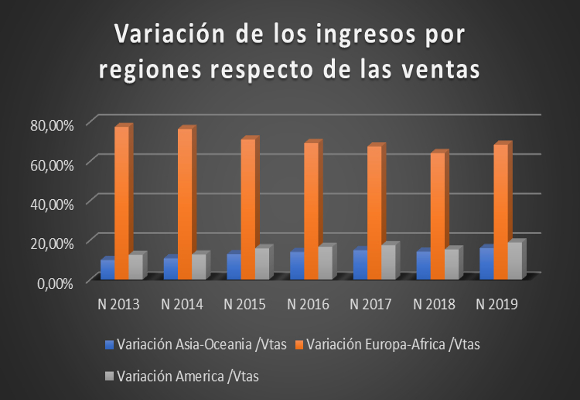 Este buen comportamiento de las ventas, se debe, fundamentalmente, a la buena evolución de los ingresos en América (+24,25 %), que era la asignatura pendiente y el mantenimiento de los crecimientos en Europa/África, con un incremento del 7,44 % y de Asia/Oceanía, con una subida del 13,37 % en lo que llevamos de año. Como podemos observar en el siguiente gráfico, la distribución de las ventas por regiones vuelve a ser menos diversificada, recuperando peso Europa/África (68,41 % del total vendido) en favor de Asia/Oceanía (16,01 %) y América (18,89 %)