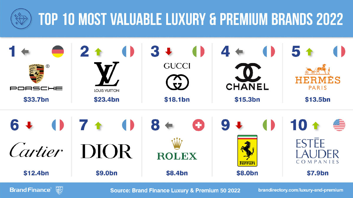 En sexto lugar se posiciona Cartier, mejorando un 3 % su valoración. En séptima posición destaca este año fuertemente Dior, subiendo un 15 % su valor y en octava posición está el grupo Rolex, con un crecimiento del 5 % y un valor de 8.350 millones de dólares. Otra de las sorpresas del año fue la marca italiana Ferrari, la cual desciende dos puestos este año ocupando la novena posición con un valor de marca de 8.047 millones de dólares. Según destaca el informe, Ferrari es la marca de lujo más fuerte del mundo con una calificación AAA+. Cierra el top ten del lujo este año, Esteé Lauder.