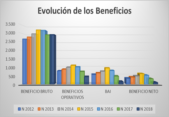 El beneficio neto, debido a la fuerte subida en los gastos intereses, no compensada por una reducción de la tasa fiscal, nos da fuerte caída respecto al año anterior del -67,86 %. El margen neto se sitúa en un exiguo 1,22 %, el más bajo de los últimos siete años, con una caída de -289 p.b. respecto al año anterior.
