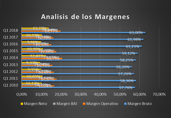 Esto ha supuesto que el Beneficio Bruto en el trimestre se situé en $ 650.900 miles, lo que representa un incremento del 16,73% respecto al año anterior. El Margen bruto se ha situado en el 63,00%, el más alto de la década.