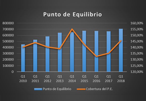Si analizamos la capacidad de la Tiffany para generar beneficios, valor y crecimiento, como podemos ver el siguiente gráfico, mientras que el punto de equilibrio tiene un ligero repunte, dándonos muestras de la necesidad de mantener las políticas correctivas en el gasto, su cobertura, por segundo año consecutivo, nos reafirma que la firma va por muy buen camino. Lo que implica la política de contención de gastos empieza a dar frutos.