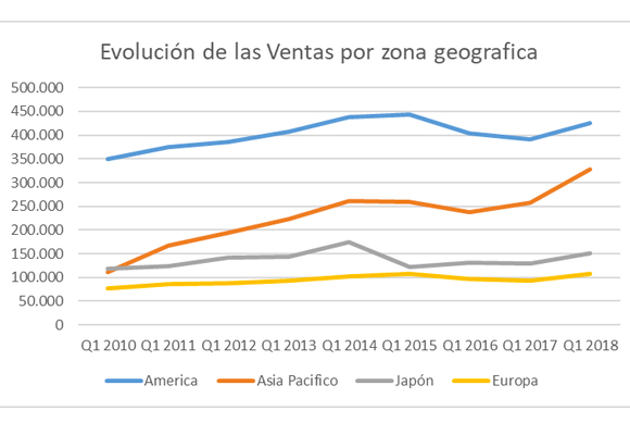 Como podemos observar, la rehabilitación del mercado americano tras dos años de caída (8,58%), que representa el 41,16%, y Asia-Pacífico (+27,71%) han ayudado a esta cifra récord.