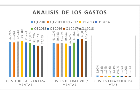 En cuanto a la cuenta de Pérdidas y Ganancias, como ya indiqué en anteriores artículos, la compañía ha mantenido una política de contención de gastos variables (+11,78% respecto al mismo periodo del año anterior), situándose en el 37,00% de las ventas, apoyada por una mayor contención en los gastos fijos que han disminuido en el primer trimestre del año sustancialmente, como podemos ver el siguiente gráfico, en relación con las ventas, situándose en el 43,22%.
