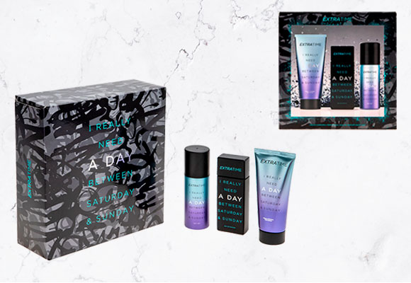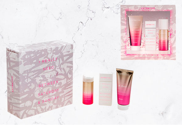 El perfume Extra Time se vende en estuches de regalo, acompañado de un body spray y una crema corporal