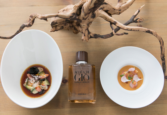 En la presentación del perfume, el estrellado chef Álvaro Salazar del restaurante Argos, ofreció dos interpretaciones comestibles del nuevo Absolu. Una mezcla de sabores marinos y terrestres que recogen la esencia del perfume más natural de Armani.