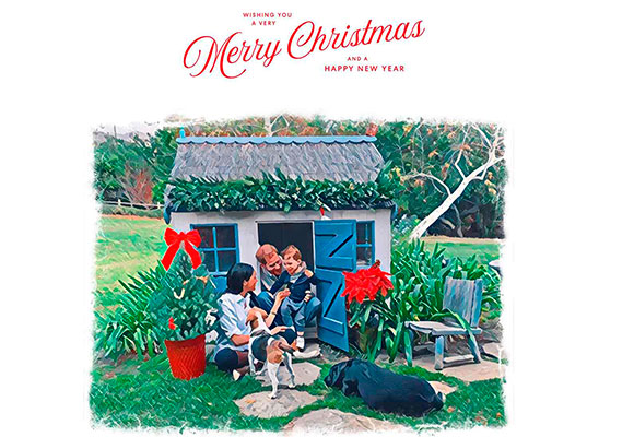 La casa familiar fue también el escenario escogido en 2020. Ese año en lugar de compartir una fotografía hicieron un dibujo en el que Harry y Meghan aparecían junto a Archie y su perrito Guy saliendo de la casa de juegos de pequeño. Un tierno dibujo con el que ya ocultaban la cara de su hijo.