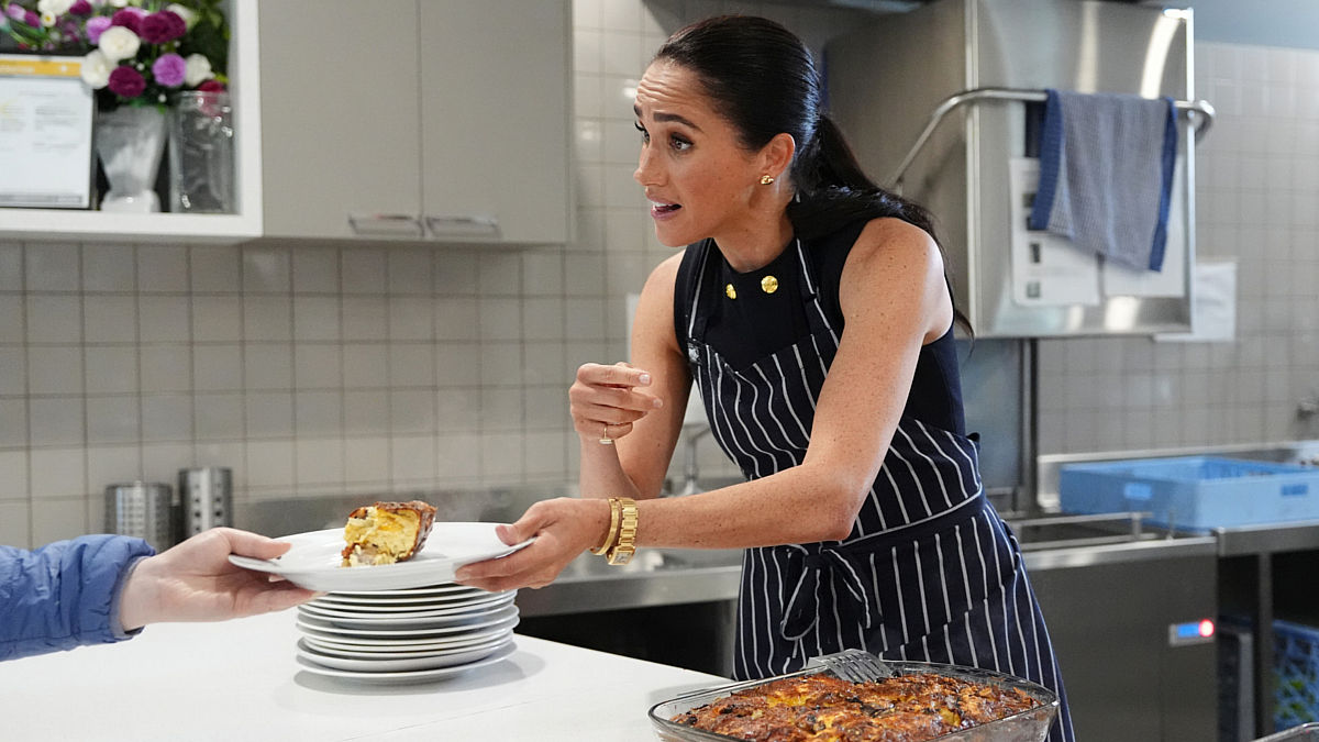 La duquesa de Sussex escoge joyas de Cartier y estilismos de miles de dólares para servir comida a personas sin hogar.