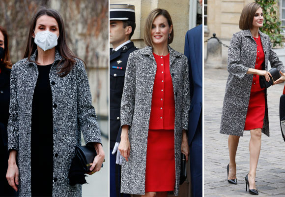 No obstante, si nos remontamos a la anterior vez que vimos a doña Letizia con el abrigo gris de hoy, nos daremos cuenta de la versatilidad de la prenda. Y es que entonces no era el elemento destacado del look, como hoy, sino un complemento al mismo. Doña Letizia lo estrenaba en junio de 2015 durante un viaje a Francia en el que el rey intervendría en la Asamblea Nacional de París. Allí lo lucía sobre un favorecedor conjunto rojo de Nina Ricci con salones de color negro de Prada y una cartera de mano negra de la misma firma similar a la de Carolina Herrera que le veíamos hoy. El corte de pelo bob, el marcado maquillaje y los tacones sin duda daban otro aire más elegante y desenfadado a la reina, que también lucía un cabello en tonos más claros y sin canas, muy visibles últimamente en su melena.
