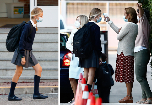 Al igual que el resto de escolares madrileños, la princesa Leonor ha entrado en el recinto escolar sola, cumpliendo con el pertinente protocolo sanitario de acceso. Desinfección de calzado, toma de temperatura, lavado de manos, mascarilla y distanciamiento.