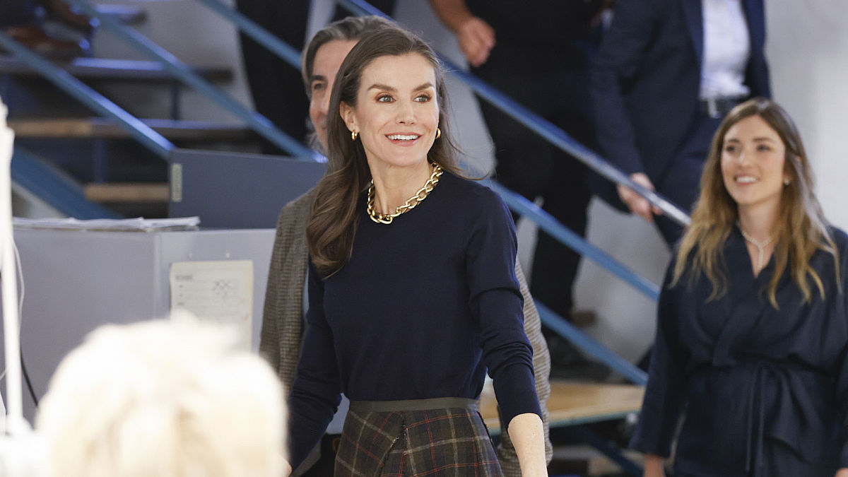 Las combinó con una falda midi de cuadros de Bimba y Lola, en tonos verde caqui, azul y granate, y un jersey azul marino. Completó el conjunto con un collar de eslabones dorados, pendientes a juego y su habitual anillo de Coreterno. Un estilismo que fusiona tradición, tendencia y sofisticación.