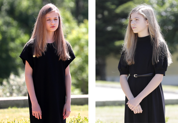 Así, los Reyes salían de su residencia acompañados por sus hijas, todos de luto riguroso, y se situaban frente a la bandera tal y como manda el protocolo. Leonor, la princesa de Asturias y heredera, a la derecha de su padre; y Sofía a la izquierda de su madre. Sin duda una imagen llamativa la de ver a los cuatro miembros de la familia de lujo cerrado. En este sentido, doña Letizia aparecía con un vestido negro por debajo de la rodilla, manga francesa con flecos y un pequeño cinturón; un atuendo muy similar al que vestía su hija pequeña, también con cinturón y media manga. Leonor por su parte prescindía de los complementos y lucía un vestido también negro pero de manga corta. Las tres llevaban la melena suelta y zapatos bajos.